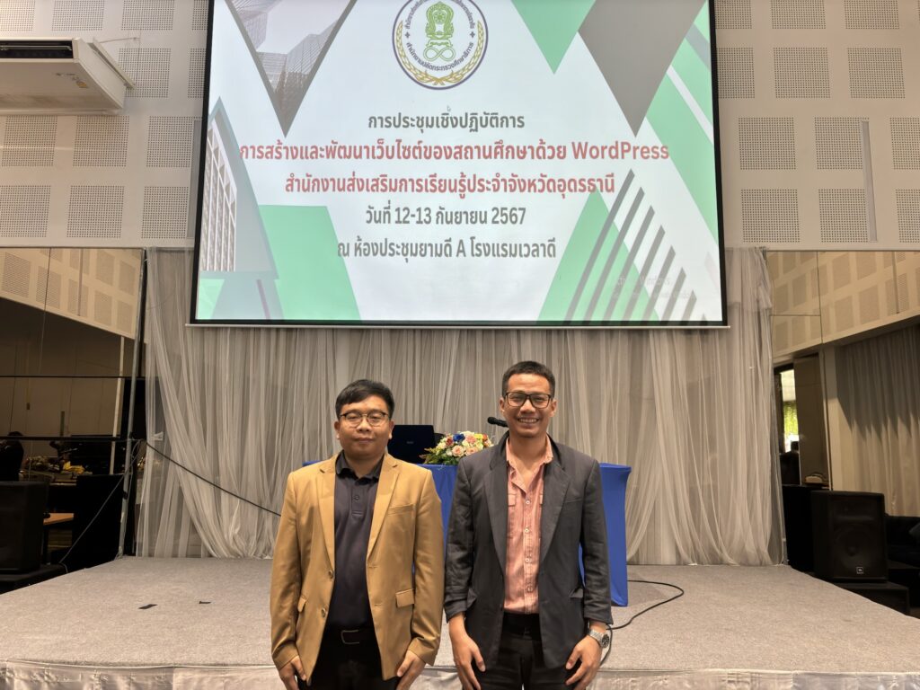 วันที่ ๑๓ กันยายน ๒๕๖๗ นายเทพพร เต็มตาวงษ์ ครู รักษาการในตำแหน่ง ผู้อำนวยการสถานศึกษา ศูนย์ส่งเสริมการเรียนรู้ระดับอำเภอทุ่งฝน มอบหมายให้ นายกริชขจร จันทร์เพชร ครู ศรช. และ นายฉลองชัย สิงหา ครูผู้สอนคนพิการ เข้าร่วมโครงการประชุมเชิงปฏิบัติการการสร้างและพัฒนาเว็บไซต์สำหรับสถานศึกษาด้วย WordPress วันที่ ๑๒-๑๓ กันยายน ๒๕๖๗ ณ โรงแรมเวลาดี อำเภอเมือง จังหวัดอุดรธานี