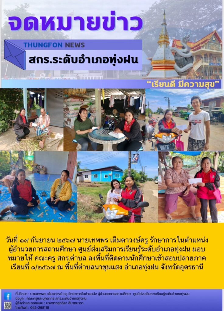 วันที่ ๑๙ กันยายน ๒๕๖๗ นายเทพพร เต็มตาวงษ์ครู รักษาการในตำแหน่ง ผู้อำนวยการสถานศึกษา ศูนย์ส่งเสริมการเรียนรู้ระดับอำเภอทุ่งฝน มอบหมายให้ คณะครู สกร.ตำบล ลงพื้นที่ติดตามนักศึกษาเข้าสอบปลายภาคเรียนที่ ๑/๒๕๖๗ ณ พื้นที่ตำบลนาชุมแสง อำเภอทุ่งฝน จังหวัดอุดรธานี