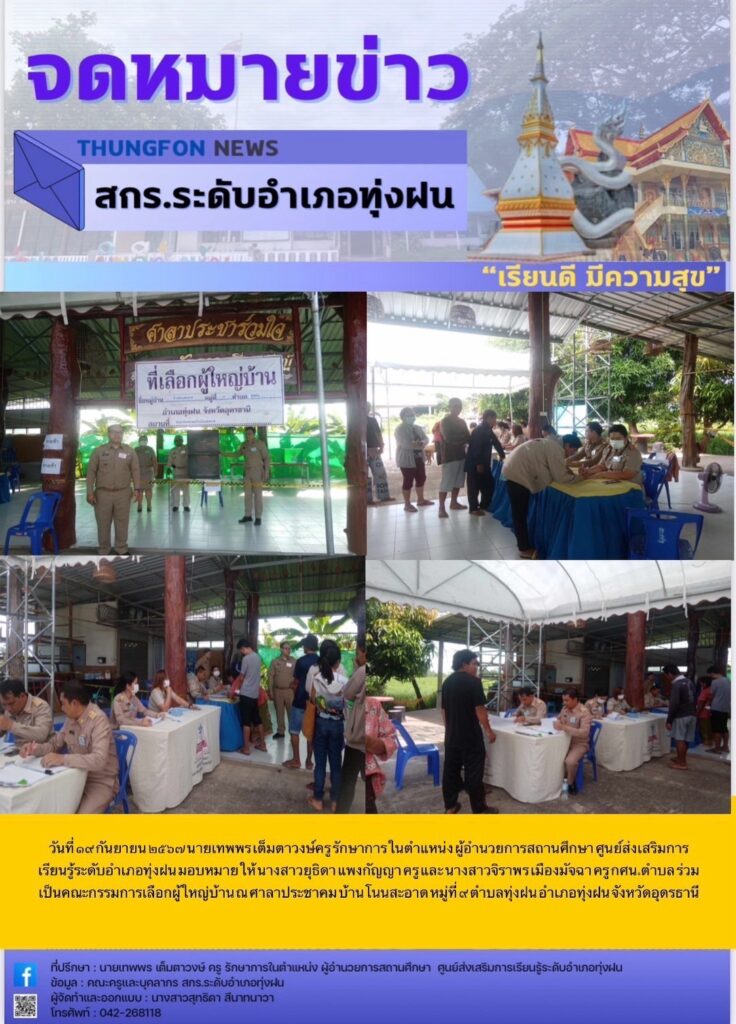 วันที่ ๑๙ กันยายน ๒๕๖๗ นายเทพพร เต็มตาวงษ์ครู รักษาการในตำแหน่ง ผู้อำนวยการสถานศึกษา ศูนย์ส่งเสริมการเรียนรู้ระดับอำเภอทุ่งฝน มอบหมายให้ นางสาวยุธิดา แพงกัญญา ครู และ นางสาวจิราพร เมืองมัจฉา ครู กศน.ตำบล ร่วมเป็นคณะกรรมการเลือกผู้ใหญ่บ้าน ณ ศาลาประชาคม บ้านโนนสะอาด หมู่ที่ ๙ ตำบลทุ่งฝน อำเภอทุ่งฝน จังหวัดอุดรธานี