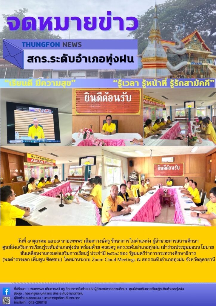 วันที่ ๗ ตุลาคม ๒๕๖๗ นายเทพพร เต็มตาวงษ์ครู รักษาการในตำแหน่ง ผู้อำนวยการสถานศึกษา ศูนย์ส่งเสริมการเรียนรู้ระดับอำเภอทุ่งฝน พร้อมด้วย คณะครู สกร.ระดับอำเภอทุ่งฝน เข้าร่วมประชุมมอบนโยบาย ขับเคลื่อนงานกรมส่งเสริมการเรียนรู้ ประจำปี ๒๕๖๘ โดยพลตำรวจเอก เพิ่มพูน ชิดชอบ รัฐมนตรีว่าการกระทรวงศึกษาธิการ ผ่านระบบ Zoom Cloud Meetings ณ สกร.ระดับอำเภอทุ่งฝน จังหวัดอุดรธานี