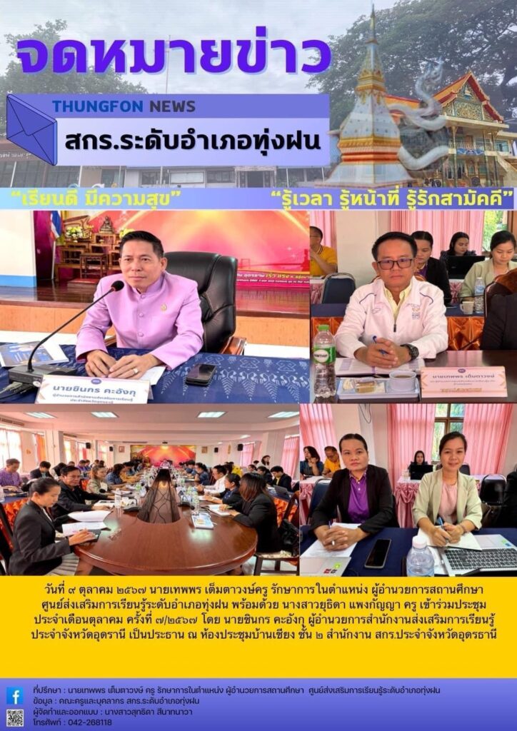 วันที่ ๙ ตุลาคม ๒๕๖๗ นายเทพพร เต็มตาวงษ์ครู รักษาการในตำแหน่ง ผู้อำนวยการสถานศึกษา ศูนย์ส่งเสริมการเรียนรู้ระดับอำเภอทุ่งฝน พร้อมด้วย นางสาวยุธิดา แพงกัญญา ครู เข้าร่วมประชุมประจำเดือนตุลาคม ครั้งที่ ๗/๒๕๖๗ โดย นายชินกร คะอังกุ ผู้อำนวยการสำนักงานส่งเสริมการเรียนรู้ประจำจังหวัดอุดรานี เป็นประธาน ณ ห้องประชุมบ้านเชียง ชั้น ๒ สำนักงาน สกร.ประจำจังหวัดอุดรธานี