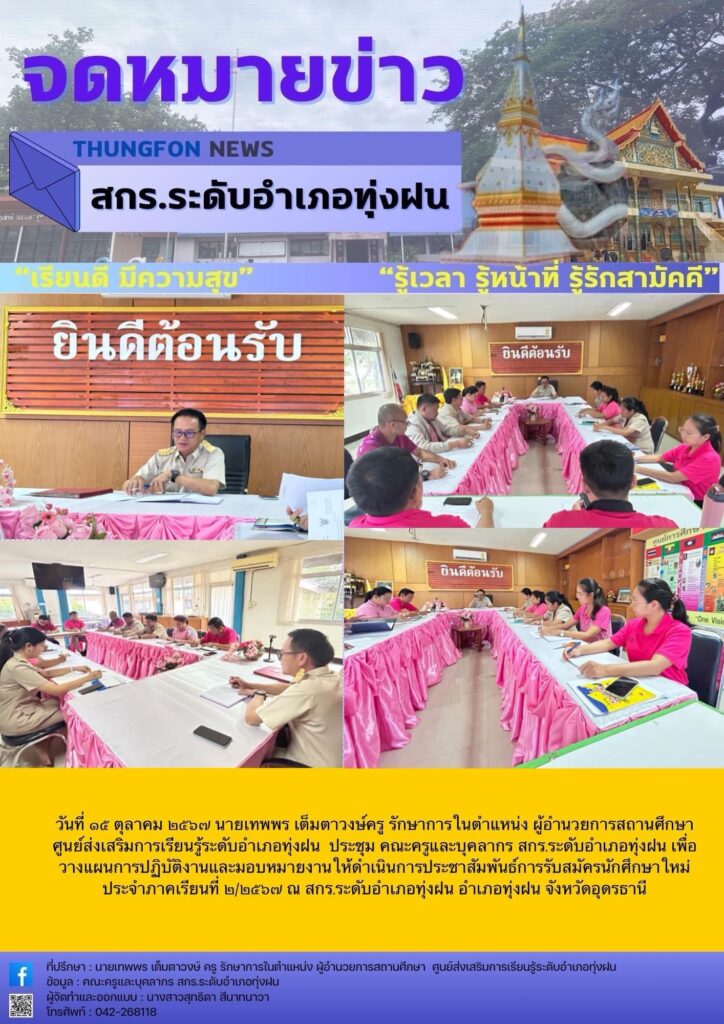 วันที่ ๑๕ ตุลาคม ๒๕๖๗ นายเทพพร เต็มตาวงษ์ครู รักษาการในตำแหน่ง ผู้อำนวยการสถานศึกษา ศูนย์ส่งเสริมการเรียนรู้ระดับอำเภอทุ่งฝน ประชุม คณะครูและบุคลากร สกร.ระดับอำเภอทุ่งฝน เพื่อวางแผนการปฏิบัติงานและมอบหมายงานให้ดำเนินการประชาสัมพันธ์การรับสมัครนักศึกษาใหม่ ประจำภาคเรียนที่ ๒/๒๕๖๗ ณ สกร.ระดับอำเภอทุ่งฝน อำเภอทุ่งฝน จังหวัดอุดรธานี