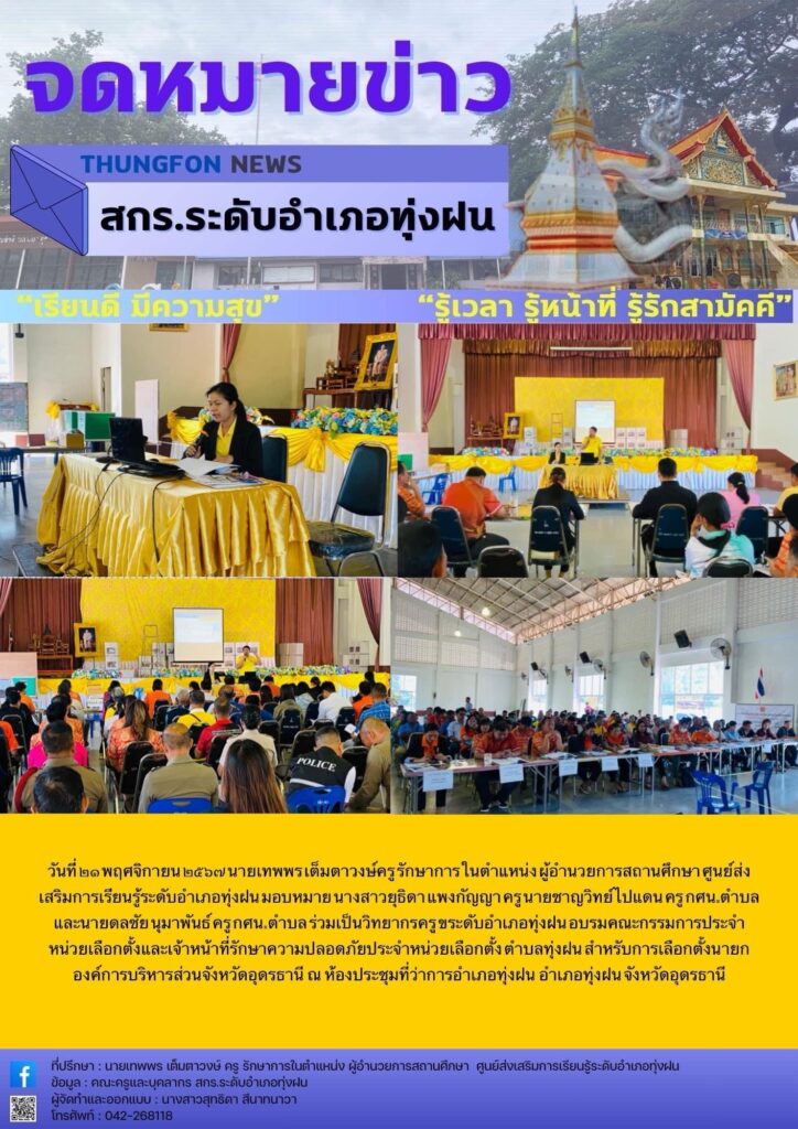 วันที่ ๒๑ พฤศจิกายน ๒๕๖๗ นายเทพพร เต็มตาวงษ์ครู รักษาการในตำแหน่ง ผู้อำนวยการสถานศึกษา ศูนย์ส่งเสริมการเรียนรู้ระดับอำเภอทุ่งฝน มอบหมาย นางสาวยุธิดา แพงกัญญา ครู นายชาญวิทย์ ไปแดน ครู กศน.ตำบล และนายดลชัย นุมาพันธ์ ครู กศน.ตำบล ร่วมเป็นวิทยากรครู ขระดับอำเภอทุ่งฝน อบรมคณะกรรมการประจำหน่วยเลือกตั้งและเจ้าหน้าที่รักษาความปลอดภัยประจำหน่วยเลือกตั้ง ตำบลทุ่งฝน สำหรับการเลือกตั้งนายกองค์การบริหารส่วนจังหวัดอุดรธานี ณ ห้องประชุมที่ว่าการอำเภอทุ่งฝน อำเภอทุ่งฝน จังหวัดอุดรธานี