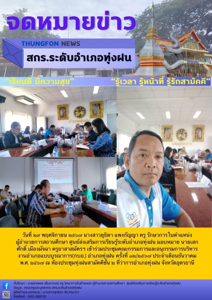 วันที่ ๒๙ พฤศจิกายน ๒๕๖๗ นางสาวยุธิดา แพงกัญญา ครู รักษาการในตำแหน่ง ผู้อำนวยการสถานศึกษา ศูนย์ส่งเสริมการเรียนรู้ระดับอำเภอทุ่งฝน มอบหมาย นายเสกศักดิ์ เมืองมัจฉา ครูอาสาสมัครฯ เข้าร่วมประชุมคณะกรรมการและอนุกรรมการบริหารงานอำเภอแบบบูรณาการ(กบอ.) อำเภอทุ่งฝน ครั้งที่ ๑๒/๒๕๖๗ ประจำเดือนธันวาคม พ.ศ. ๒๕๖๗ ณ ห้องประชุมทุ่งฝนสามัคคีชั้น ๒ ที่ว่าการอำเภอทุ่งฝน จังหวัดอุดรธานี