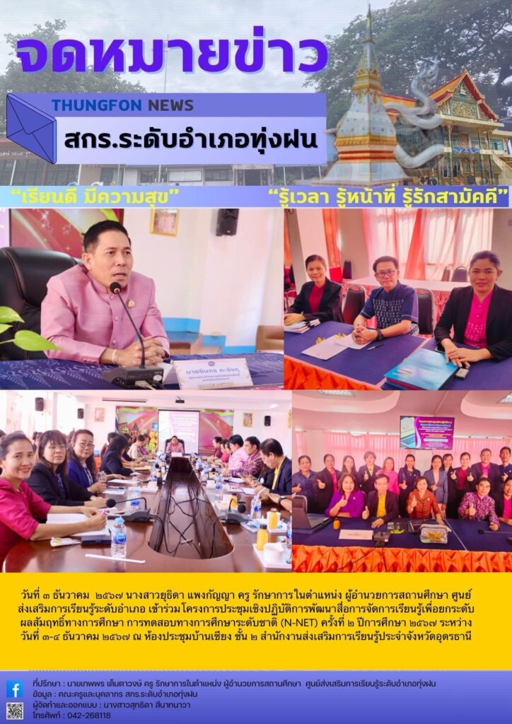 วันที่ ๓ ธันวาคม ๒๕๖๗ นางสาวยุธิดา แพงกัญญา ครู รักษาการในตำแหน่ง ผู้อำนวยการสถานศึกษา ศูนย์ส่งเสริมการเรียนรู้ระดับอำเภอเข้าร่วมโครงการประชุมเชิงปฏิบัติการพัฒนาสื่อการจัดการเรียนรู้เพื่อยกระดับผลสัมฤทธิ์ทางการศึกษา การทดสอบทางการศึกษาระดับชาติ (N-NET) ครั้งที่ ๒ ปีการศึกษา ๒๕๖๗ ระหว่างวันที่ ๓-๔ ธันวาคม ๒๕๖๗ ณ ห้องประชุมบ้านเชียง ชั้น ๒ สำนักงานส่งเสริมการเรียนรู้ประจำจังหวัดอุดรธานี