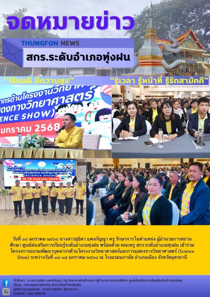 วันที่ ๑๔ มกราคม ๒๕๖๘ นางสาวยุธิดา แพงกัญญา ครู รักษาการในตำแหน่ง ผู้อำนวยการสถานศึกษา ศูนย์ส่งเสริมการเรียนรู้ระดับอำเภอทุ่งฝน พร้อมด้วย คณะครู สกร.ระดับอำเภอทุ่งฝน เข้าร่วมโครงงการอบรมพัฒนาบุคลากรด้านโครงงานวิทยาศาสตร์และการแสดงทางวิทยาศาสตร์ (Science Show) ระหว่างวันที่ ๑๔-๑๕ มกราคม ๒๕๖๘ ณ โรงแรมนภาลัย อำเภอเมือง จังหวัดอุดรธานี